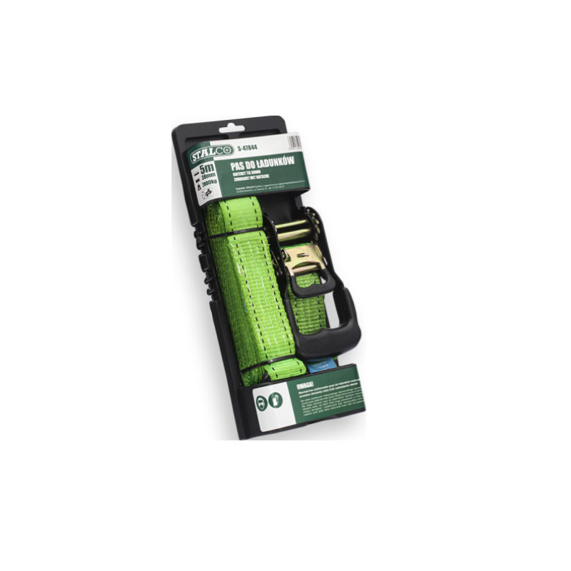 Głównym elementem mocującym jest hak ze stali węglowej, pokryty mocnym lakierem, który zapewnia nie tylko trwałość, ale również skuteczne utrzymywanie obciążeń do 2 ton. Klamra z mechanizmem zapadkowym wykonana jest ze stali węglowej ocynkowanej, co zapewnia ochronę przed korozją i gwarantuje bezpieczne spinanie ładunku. Uchwyt klamry pokryty jest warstwą tworzywa sztucznego, co zwiększa komfort pracy użytkownika poprzez zapewnienie pewnego chwytu i redukcję ryzyka przypadkowego zsunięcia się z pasa. Pasy do ładunków STALCO mają długość 5 metrów, co czyni je wszechstronnym narzędziem w branży transportowej, idealnym do różnorodnych zastosowań zarówno w profesjonalnych flotach transportowych, jak i przy codziennym użytkowaniu przez kierowców dostawczych. Dzięki wysokiej nośności wynoszącej 2000 kg, te pasy gwarantują nie tylko bezpieczeństwo transportu, ale również łatwość i efektywność w spinaniu i mocowaniu ładunków.
