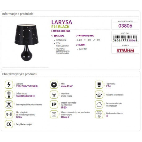 Lampa stołowa LARYSA o nowoczesnym wyglądzie to elegancki i luksusowy dodatek do każdego wnętrza. Elegancki czarny klosz z uroczym wzorem i ciemna podstawa z pewnością przyciągną wzrok, gdy ustawisz lampkę w swoim mieszkaniu. Produkt został wykonany z materiałów wysokiej jakości i z niezwykłą dbałością o szczegóły. Jest to dobry zakup, który będzie cieszył oczy swoim pięknym wyglądem przez długi czas.