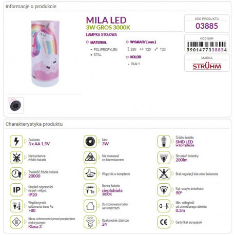 Wewnątrz znajduje się źródło światła LED o mocy 3W, jest to odpowiednik 20W starego typu żarówki. Lampkę zasila się za pomocą baterii 3 x AA 1,5V. Linia lamp MILA wykonana z bezpiecznego materiału oszczędzi nam trudów i wątpliwości, które towarzyszą projektowaniu nowej przestrzeni oraz rozświetli na nowo wnętrze naszego domu – zarówno dosłownie, jak i w przenośni. Lampka dekoracyjna LED, nie jest zabawką.