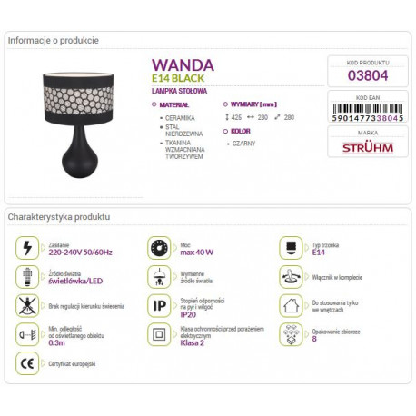Lampa stołowa WANDA o nowoczesnym wyglądzie to elegancki i luksusowy dodatek do każdego wnętrza. Zaletą tej klasycznej lampki nocnej jest klosz, na której umieszczony jest modny wzór. Produkt został wykonany z materiałów wysokiej jakości i z niezwykłą dbałością o szczegóły. Jest to dobry zakup, który będzie cieszył oczy swoim pięknym wyglądem przez długi czas.