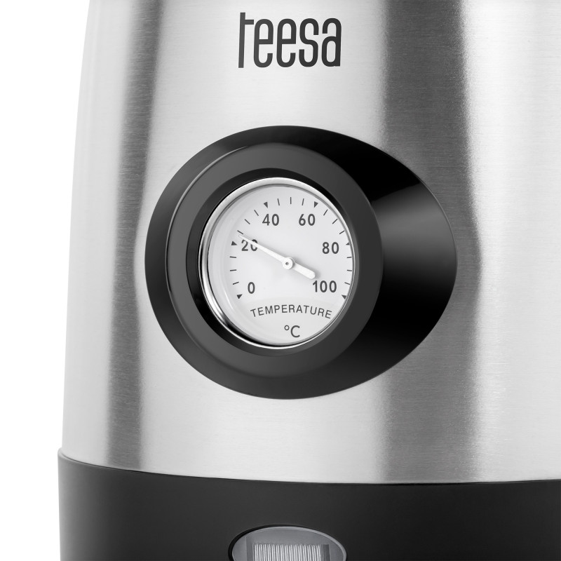 Czajnik elektryczny Teesa TSA1513 to doskonały wybór dla tych, którzy cenią sobie precyzyjne przygotowanie gorących napojów. Dzięki wskaźnikowi temperatury umieszczonemu na metalowej obudowie, możesz w łatwy sposób kontrolować, czy woda osiągnęła odpowiednią temperaturę dla zaparzenia różnych rodzajów napojów. To szczególnie przydatne, jeśli zależy Ci np. na przygotowaniu idealnej zielonej herbaty Wskaźnik poziomu wody pozwala szybko sprawdzić ilość wody w czajniku bez konieczności otwierania pokrywy, co dodatkowo zwiększa komfort użytkowania.