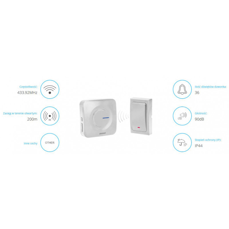 Dzwonek bezprzewodowy do drzwi firmy Orno w kolorze białym , to prosta przewodowa konstrukcja w obudowie z tworzywa sztucznego. Dzwonek do drzwi posiada przyjemny dla ucha dźwięk, o głośności na poziomie 90 dB z możliwością regulacji. Dzwonek przeznaczony jest do użytkowania w pomieszczeniach wyposażonych w instalację dzwonkową o napięciu 230 V AC. Ze względu na stopień ochrony IP44, produkt może być umieszczany w pomieszczeniach o zwiększonej wilgotności.