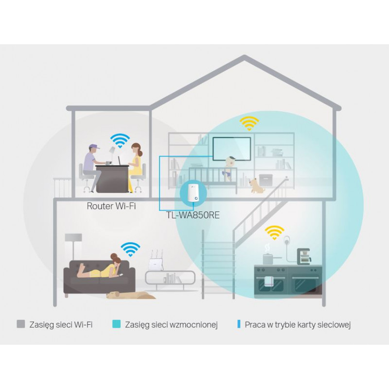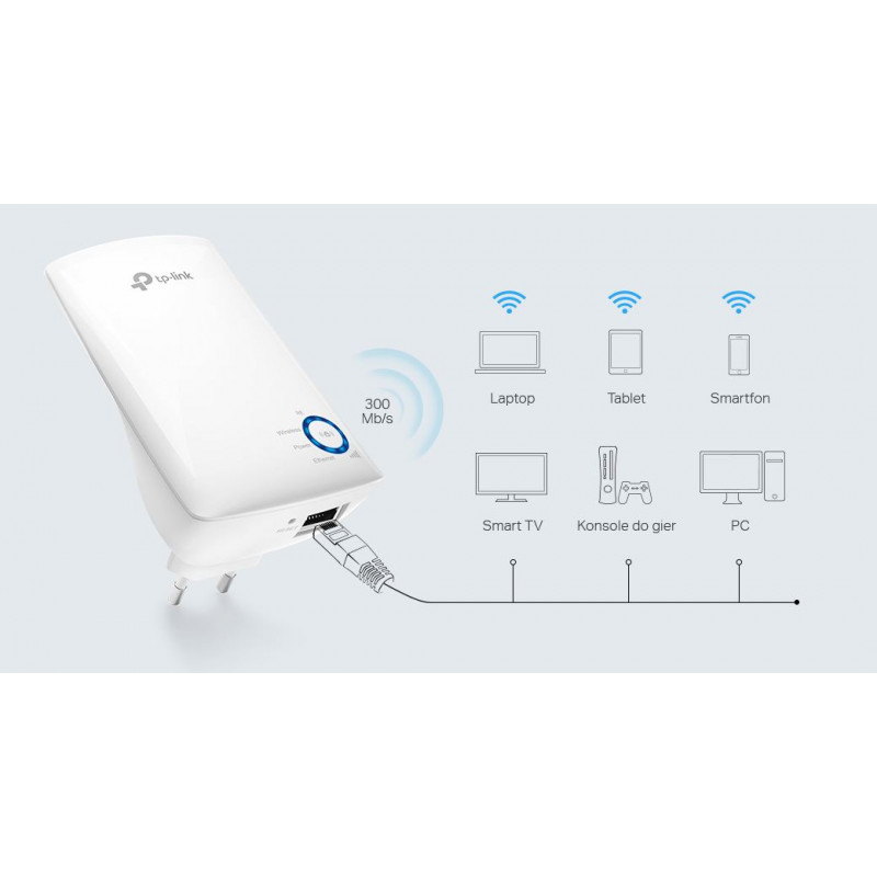 Wzmacniacz sygnału bezprzewodowego TP-LINK TL-WA850RE przeznaczony jest do zwiększenia zasięgu i siły sygnału istniejącej sieci bezprzewodowej w celu wyeliminowania martwych stref. Dzięki połączeniom bezprzewodowym w standardzie N o prędkości do 300Mb/s, przyciskowi Range Extender, miniaturowym wymiarom i możliwości montażu na ścianie urządzenie umożliwia rozszerzenie zasięgu sieci bezprzewodowej w sposób prosty jak nigdy dotąd.