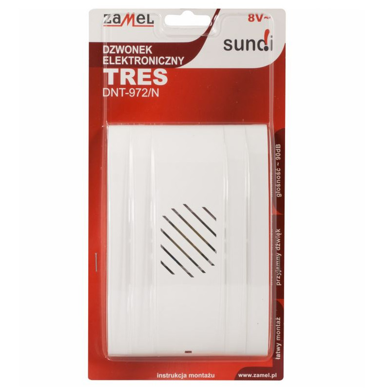 Dzwonek przewodowy do drzwi w kolorze białym firmy ZAMEL, to prosta przewodowa konstrukcja w obudowie z tworzywa sztucznego. Dzwonek do drzwi posiada przyjemny na przemian brzmiący trójtonowy dźwięk, o głośności na poziomie 90 dB z możliwością regulacji. Mocowany do ściany za pomocą 2 wkrętów załączonych do zestawu. Dzwonek firmy ZAMEL przeznaczony jest do użytkowania w pomieszczeniach wyposażonych w instalację dzwonkową o napięciu 9 V AC.
