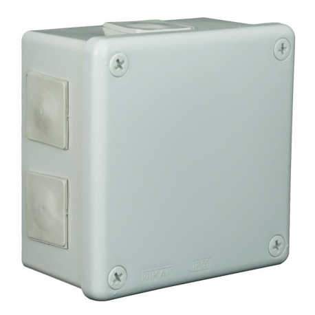Puszka instalacyjna hermetyczna, gumowe zaślepki, 8-wlotowa kablowych, w kolorze popielatym,. Miejsca posadowienia otworów montażowych dodatkowo zabezpieczone gumowymi zaślepkami, co zapewnia szczelność konstrukcji. Zamykana na cztery plastikowe wkręty zapewni szybki i pewny montaż. Charakteryzuje się stopniem ochrony IP55, który zapewnia wysoką ochronę przed wnikaniem pyłu oraz kropel wody.