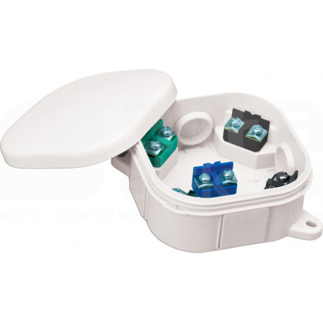 Surface mounted hermetic installation box, 5 terminals, 4 inlets, white color The box has dimensions 92x92x44mm. It was made of durable plastic, which ensures its durability and lack of deformation. It has 4 inlets protected by rubber glands. It closes with a click. It is characterized by a degree of protection IP54, which provides high protection against the ingress of dust and water droplets.