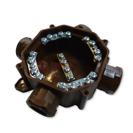 Hermetic installation box, 12-inlet, with weakening, with clamps, in brown color. The box has dimensions of 100x100x41mm and 12 cable inlets. It is characterized by IP54 degree of protection, which provides high protection against the ingress of dust and water droplets.