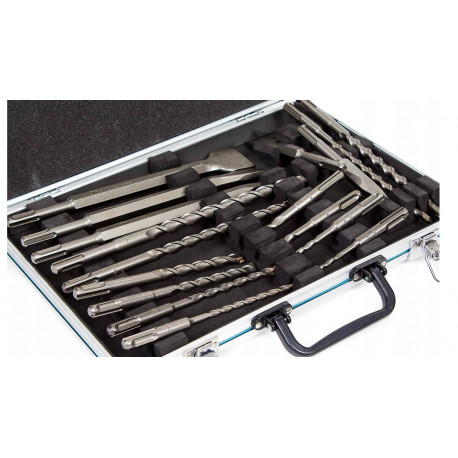 The set includes 17 parts: 5mm diameter drill and total length 110mm, 6mm diameter drill and total length 110mm 8mm diameter drill and total length 110mm, 10mm diameter drill and total length 110mm, 6mm diameter drill and total length 160mm, 8mm diameter drill and total length 160mm, 10mm diameter drill and total length 160mm, ;drill bit with a diameter of 12mm and total length of 160mm, drill bit with a diameter of 8mm and total length of 210mm, drill bit with a diameter of 10mm and total length of 210mm, drill bit with a diameter of 12mm and total length of 260mm, drill bit with a diameter of 14mm and total length of 260mm, two picks with lengths: 140mm and 250mm, a chisel 20mm wide and 250mm long, a chisel 21mm wide and 140mm long, a chisel 40mm wide and 250mm long.