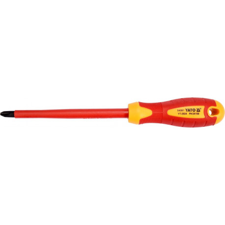 YT-2824 Phillips screwdriver with VDE insulation, made of durable S2 steel with HRC hardness of 56-60. VDE-certified tools are a guarantee of safety when performing work on electrical installations or equipment under voltage up to 1000V. YATO VDE tools have non-slip properties, and the fully insulated series is perfect for working with materials prone to scratching. VDE insulation not only effectively protects against electric shock, but will also protect the user from accidental scratching of plastic materials or non-ferrous metals such as copper, brass and aluminum.