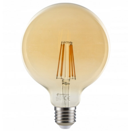Żarówka LED z trzonkiem E27 odpowiednik żarówki tradycyjnej o takim samym trzonku. G95 oznacza kształt kuli. Diody LED w kształcie włókien – filamentów. Zasilana napięciem 230V przemiennym. Dostępna o mocy 10W w barwie ciepłej. Seria tych dekoracyjnych żarówek LED przyciąga wzrok swoim niespotykanym dotąd wyglądem dającym efekt przydymionego światła. Żarówki LED GLOB FILAMENT idealnie podkreślą nowoczesność Waszych wnętrz, zachwycając imponującym efektem świetlnym. Liczba lumenów może różnić się o +- 15%, co jest zależne od partii dostarczonej przez producenta!