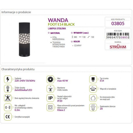 WANDA FOOT lamp is sure to please you not only with its high functionality, but above all with its remarkable modern design. Inside there is an E14 socket (small thread). The lamp is made of stainless steel and plastic-reinforced fabric lampshade, so it is not a cheap Chinese substitute! It creates a soft, cozy mood in the room. The lamp will be perfect for reading a book, working or simply relaxing. It is possible to use LED bulb which will reduce electricity costs by up to 90%! Light bulbs available on our other auctions.