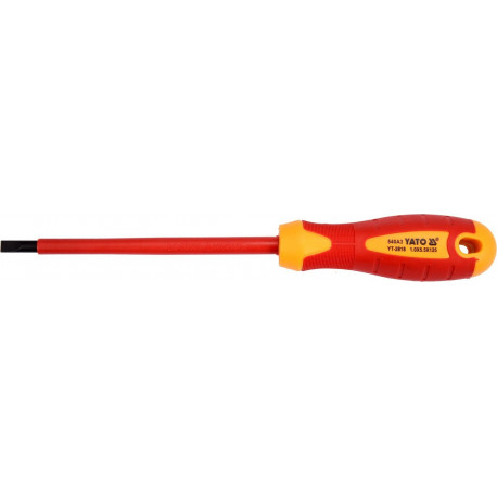 Wkrętak płaski YT-2818 z izolacją VDE, wykonany z wytrzymałej stali S2 o twardości HRC 56-60. Narzędzia z certyfikatem VDE to gwarancja bezpieczeństwa podczas wykonywania prac przy instalacjach elektrycznych, czy urządzeniach będących pod napięciem do 1000V. Narzędzia YATO VDE posiadają właściwości antypoślizgowe, a seria pełnoizolowana doskonale sprawdzi się podczas pracy przy materiałach podatnych na zarysowania. Izolacja VDE nie tylko skutecznie chroni przed porażeniem prądem, ale również zabezpieczy użytkownika przed przypadkowym porysowaniem materiałów z tworzywa sztucznego czy metali kolorowych takich jak miedź, mosiądz czy aluminium.