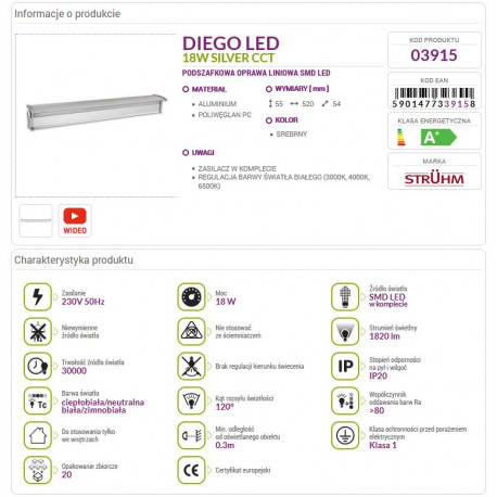 Produkt posiada możliwość regulacji barwy światła: ciepła, neutralna oraz zimna (3000K/4000K/6500K). Lampa liniowa LED działa z mocą aż 18W, a jej strumień świetlny równy jest 1820 lumenów. Ze względu na stopień odporności IP20 oprawa może być stosowana tylko we wnętrzach. Wymiary produktu to: 55 x 520 x 54 mm. Oprócz doskonałych wrażeń świetlnych zapewnia idealną widoczność.