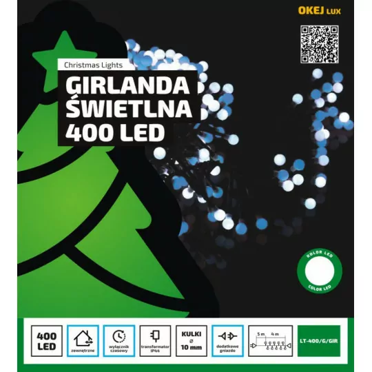 Outdoor Christmas tree lights in the shape of decorative round beads are great for Christmas decorations. 400 LEDs for holiday lighting and making striking Christmas decorations. The points of light are spaced densely and evenly every 1cm, on a black, solidly insulated cable, making a total of 4 meters of decorations. The lights fit perfectly in the branches of a traditional Christmas tree, are safe and suitable for outdoor use. The round caps on the LEDs, the so-called "pearls", give this set a very aesthetic and original look.