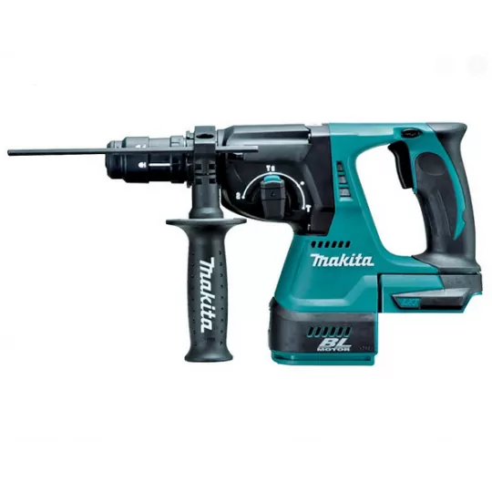 Szybkowymienny uchwyt do końcówek SDS-PLUS można łatwo wymienić na szybkowymienny uchwyt wiertarski. Ogranicznik głębokości wiercenia jest udogodnieniem dla wiercenia otworów o jednakowej głębokości. W celu zapewnienia bezpieczeństwa obsługi korzystamy z uchwytu bocznego. Do wiercenia w cegle, betonie, itp. używamy wierteł z ostrzami z węgliku wolframu. Do wiercenia w drewnie, metalu lub tworzywach sztucznych użyjemy wiertła krętego lub wiertła do drewna. Aby dłutować, obciosywać, wyburzać, itp. będziemy potrzebować punktaków, dłut, dłut do skuwania, itp. Model DHR243RTJ umożliwia przestawianie dłuta w 40 pozycjach. Włącznik elektroniczny pomaga w rozpoczęciu pracy w dokładnie określonym punkcie. Unikalna konstrukcja gumowych połączeń zmniejsza poziom wibracji, które docierają do akumulatora, dzięki czemu będzie dłużej nam służył. Współpracuje z systemem odsysania pyłu DX02 (opcjonalnie).