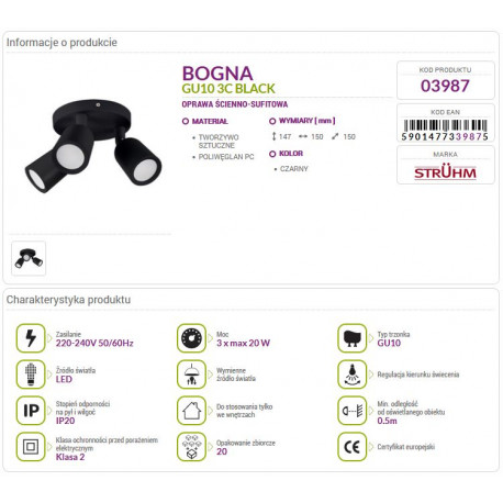 TheBONGA wall and ceiling lamp by STRUHM is a product equipped with three light sources with GU10 threads and a maximum output of 20W. The lamp has movable light sources, so you can set where it will shine freely, where you happen to need it. The lamp can be mounted both on the ceiling as a plafond and on the wall as a wall lamp. BOGNA is the perfect solution for the kitchen, bathroom, room and hallway. The room in which it will be installed will give a classic, elegant and modern look. The lamp is sold without bulbs included, so you can adjust the power and color of light to suit your needs.