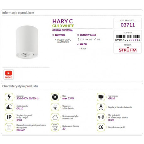 Lampa sufitowa HARY C biała 03711 GU10 Struhm