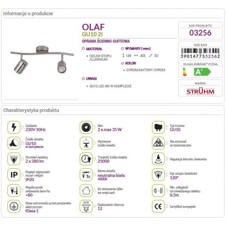 <![CDATA[<p>High-quality modern decorative fixtures by <b>STRUHM</b>. These incredibly simple yet eye-catching lamps will become both a focal point of the decor and a functional complement to modern arrangements. Choosing this stylish collection, we can match lighting to any interior of the house starting from a representative <b>saloon</b>, through a modern <b>office</b>, and ending with a stylish <b>bedroom</b>.</p> <p>The line of lamps<b> OLAF </b>made of <b>cast aluminum alloy </b>will save us the hardships and doubts that accompany the design of a new space, and will illuminate anew the interior of our home - both literally and figuratively. The lamp has <b>2</b> light sources with <b>GU10 max 35W threads. </b>With the bulbs<b> LED </b>(included) you will save up to 90% of electricity! On our other auctions you will also find other models of the brand!</p> <p><img src="https://upload.cdn.baselinker.com/products/1005862/6713323_3.jpg?time=1614066380697" alt="https://upload.cdn.baselinker.com/products/1005862/6713323_3.jpg?time=1614066380697" style="display: block; margin-left: auto; margin-right: auto;" /></p>