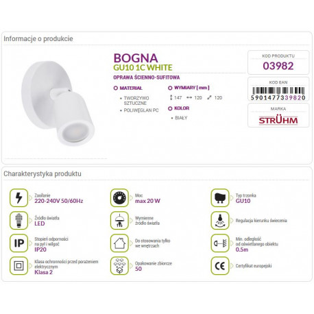BONGA wall lamp by STRUHM is a product equipped with one light source with GU10 thread and maximum power of 20W. The lamp has a movable light source, so you can set where it will shine freely, where you happen to need it. The lamp can be mounted both on the ceiling as a plafond and on the wall as a wall lamp. BOGNA is the perfect solution for the kitchen, bathroom, room and hallway. The room in which it will be installed will give a classic, elegant and modern look. The lamp is sold without bulbs included, so you can adjust the power and color of light to suit your needs.