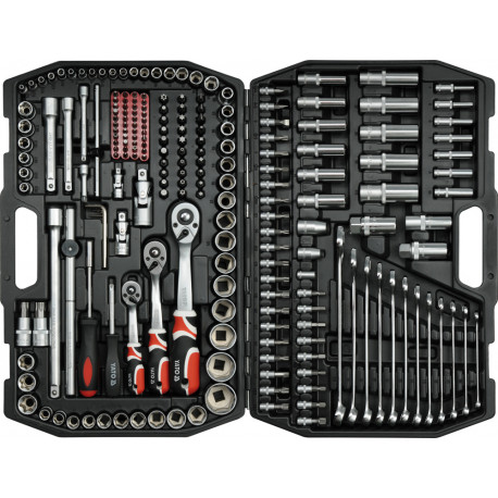 Professional tool set, which was manufactured to meet the needs of professional automotive and mechanical service. All tools are made of durable, tool-grade CrV 50BV3 chrome vanadium steel. The set allows work requiring very heavy loads and precision, and allows you to perform many service activities related to unscrewing and screwing threaded connections of different nominal sizes.