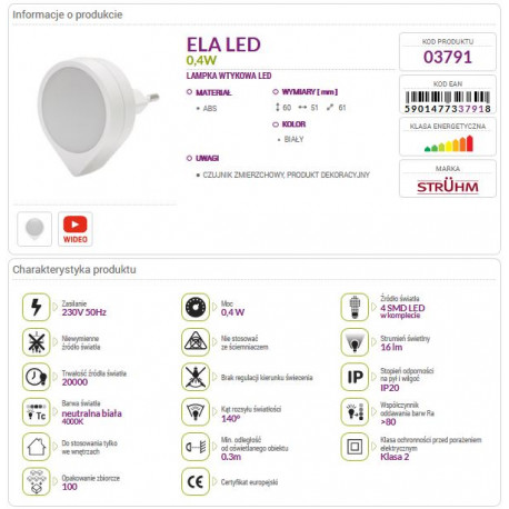 Lampka wtykowa ELA LED służy jako delikatne oświetlenie nocne, które pozwala na orientację w ciemnych pomieszczeniach. Doskonale sprawdza się w pokojach dziecięcych, sypialniach i przedpokojach. Niski pobór mocy pozwala na świecenie przez całą dobę, a małe gabaryty powodują, że można ją zabrać ze sobą na urlop do hotelu i poczuć się komfortowo w nocy na nieznanym nam terenie. Wyjątkowy kształt zachwyci każdego. Możliwość elastycznego wkładania do dowolnego gniazda wtykowego wewnątrz domu pozwala na wykorzystanie lampki w niemal każdym pomieszczeniu.