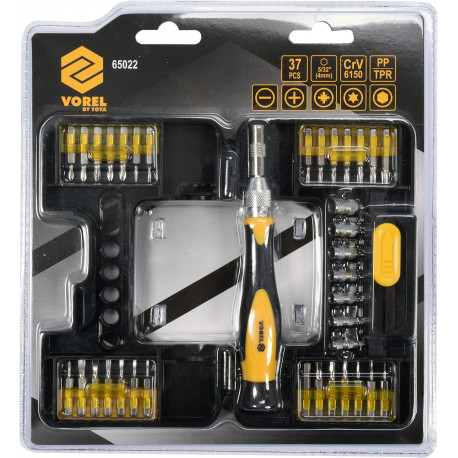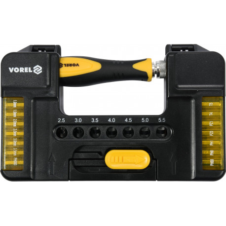 Precision screwdriver set with interchangeable tips by Vorel 65022. It has a sturdy handle of ergonomic shape with rubberized parts for increased grip security. Ratchet with switch - right, left, lock. Packaged in a practical case made of durable plastic.