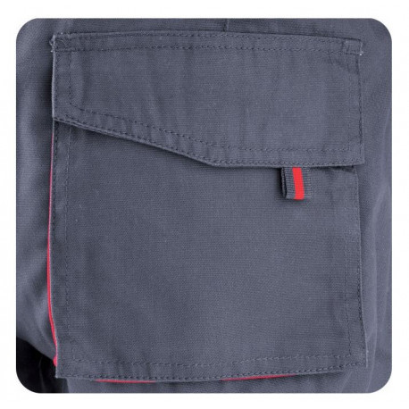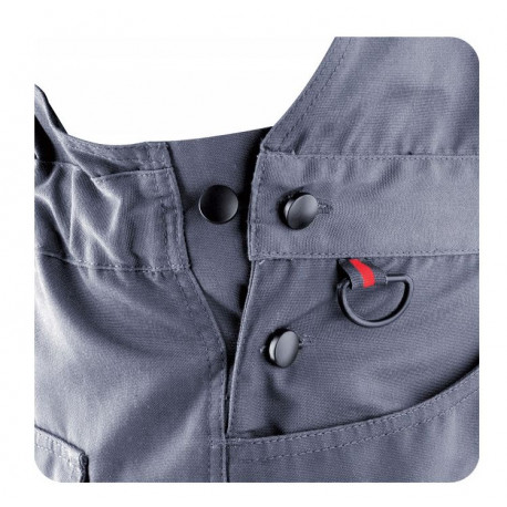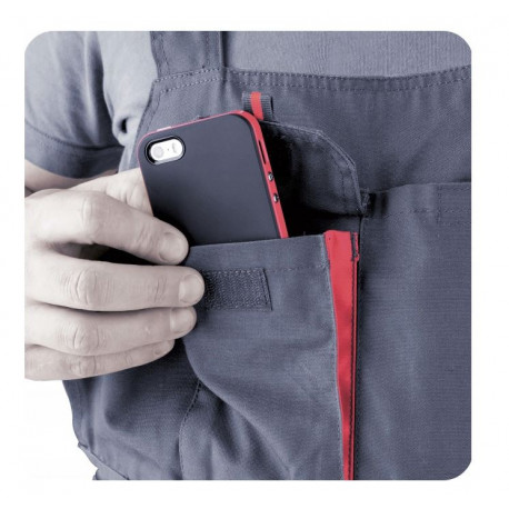 Work pants with suspenders, sewn from thick tear-resistant material based on cotton and polyester / 35% and 65% /. Gray color with black and red accessories. They have four large patch pockets two on the front and two on the back, as well as a special cell phone pocket on the leg. On the front on the legs sewn reinforcements of polyester fabric designed to place knee guards., Chest flap with two pockets and adjustable harness attachment.
