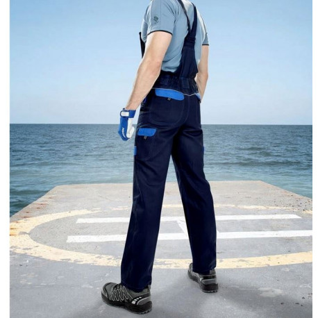 Work pants with suspenders, sewn from thick tear-resistant material meet all standards of occupational health and safety. The product is distinguished by good quality 260 g/m2 fabric and original cut. But also fashionable elements such as rounded pocket lines, double stitching in a contrasting color, reflective elements and piping, double-reinforced knee areas and multifunctional tool pockets.