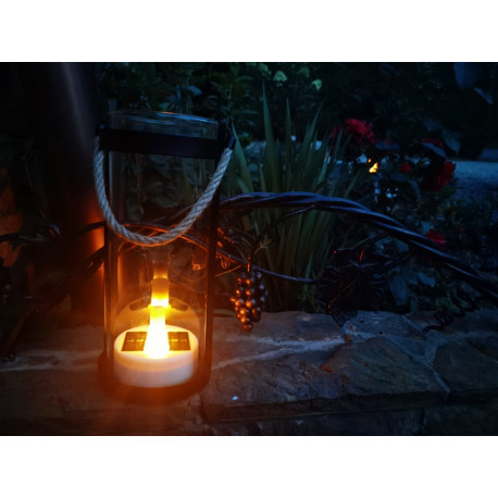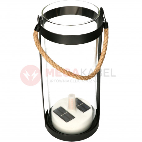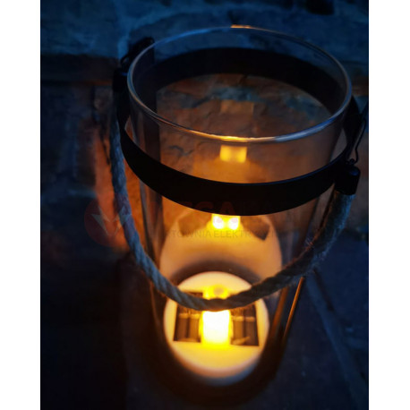 Solar lantern in industrial style, will prove to be a decorative and practical lighting for your garden. The interesting model of the lantern will be a unique addition in your garden. The base of the light is made of black lacquered steel. This adds to its charisma and strongly modern style. Lightness of the whole lamp is given by the glass shade in a very simple cylindrical form. An additional and at the same time functional element of this lamp is the decorative handle, which was made of thick brown cord. It allows a wider range of use of the llama. The warm color of the light will delightfully diffuse through your garden. The lighting has a burning candle effect. An LED was used as the light source.
