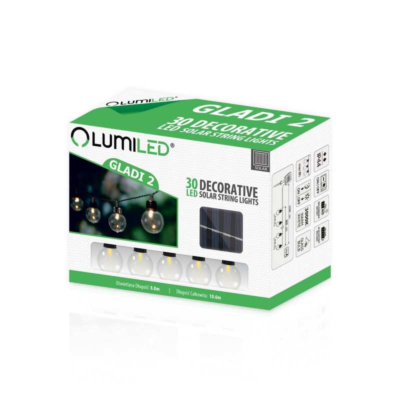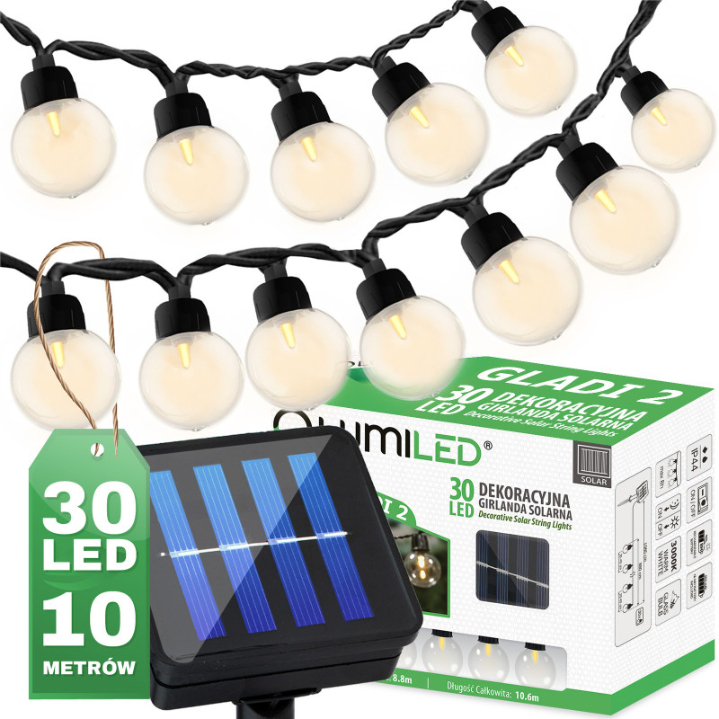 Girlanda solarna ogrodowa GLADI-2, to idealna ozdoba do tworzenia magicznej atmosfery w Twoim ogrodzie lub na tarasie. Wyposażona w 30 diod LED o ciepłym odcieniu światła (3000K) i ozdobne kulki, ta girlanda dodaje uroku i elegancji każdemu miejscu, gdzie jest używana.
