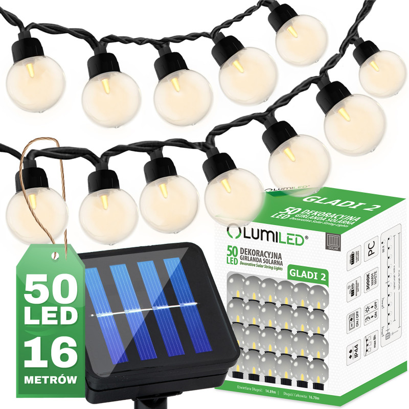 Girlanda solarna ogrodowa GLADI-2, to idealna ozdoba do tworzenia magicznej atmosfery w Twoim ogrodzie lub na tarasie. Wyposażona w 50 diod LED o ciepłym odcieniu światła (3000K) i ozdobne kulki, ta girlanda dodaje uroku i elegancji każdemu miejscu, gdzie jest używana.