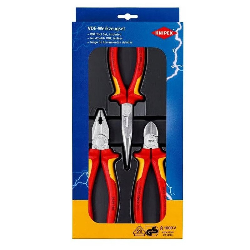 Zestaw szczypiec do izolacji KNIPEX 002012 to wyjątkowy komplet narzędzi, który łączy w sobie wysoką jakość wykonania z bezpieczeństwem użytkowania. Te szczypce są izolowane zgodnie z normami VDE, co pozwala na pracę z napięciem do 1000 V, zapewniając pełną ochronę podczas pracy z instalacjami elektrycznymi. Spełniają one wymagania normy DIN EN/IEC 60900, co jest szczególnie istotne dla profesjonalistów zajmujących się elektryką.