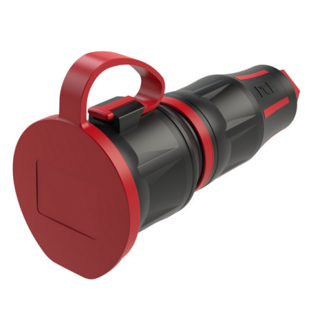 Gniazdo posiada zacisk śrubowy do mocnego i niezawodnego połączenia przewodów oraz styki ochronne (bolec) dla bezpieczeństwa użytkowania. Konstrukcja z prostym kierunkiem wprowadzenia wtyczki i szybkim zamknięciem zapewnia łatwy i szybki montaż.