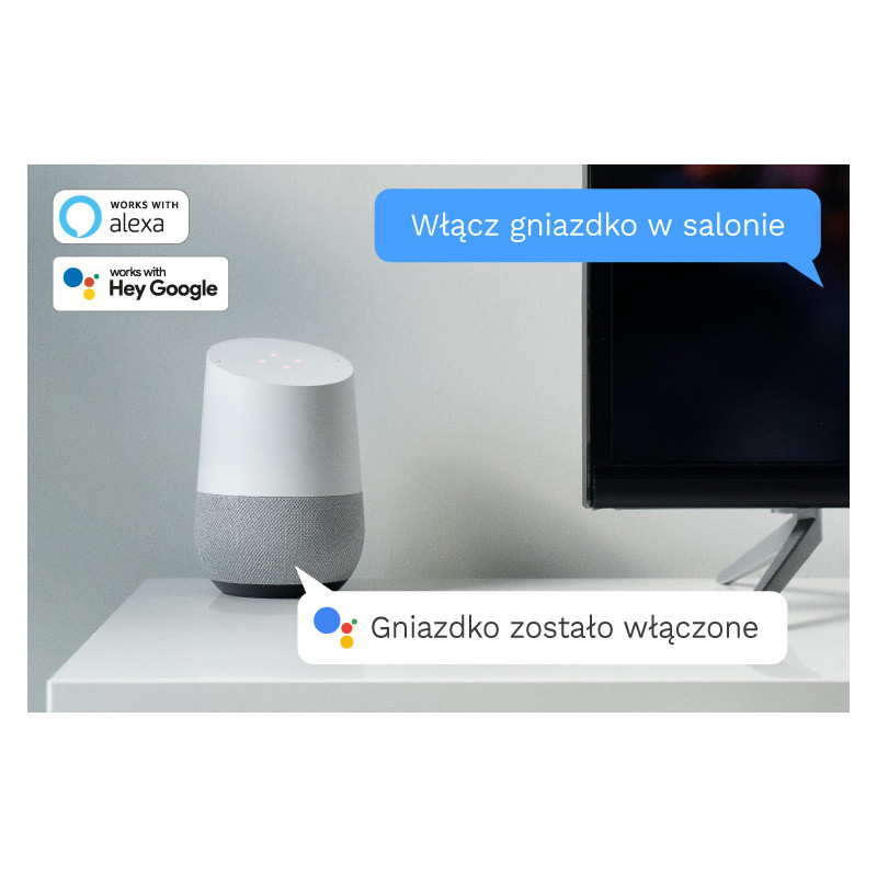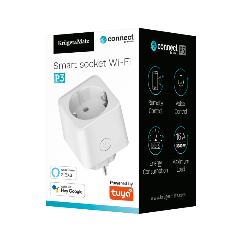Inteligentne gniazdo Kruger&Matz współpracuje z Asystentem Google oraz Amazon Alexa. Wystarczy, że sparujesz je z aplikacją Tuya i wybierzesz asystenta, a nie ruszając się z kanapy możesz głosowo włączać i wyłączać podłączone do Connect P3 sprzęty w swoim domu.