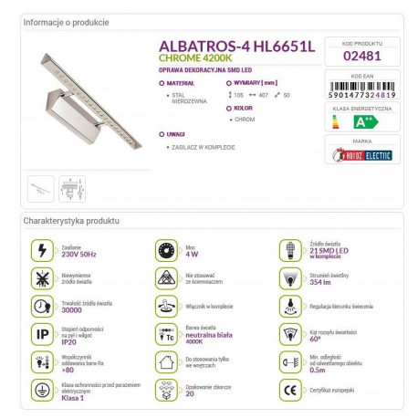 Wysokiej jakości nowoczesna oprawa dekoracyjna marki HOROZ. Produkt ten wykorzystywany jest najczęściej do oświetlania obrazów lub luster, z pewnością można jednak znaleźć dla niego szereg innych zastosowań. Całość została wykonana ze stali nierdzewnej w kolorze chrom. Nie jest to tani zamiennik!