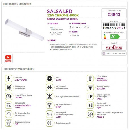 Kinkiet nad lustro SALSA LED 12W chrom 4000K 03843