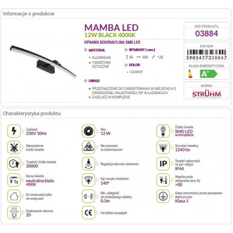 Rozwiązanie to pozwoliło na uzyskanie strumienia świetlnego wynoszącego 1240 lm o barwie neutralnej 4000K przy jednoczesnym niskim poborze energii 12W co odpowiada około 100W klasycznego źródła światła. Oprawa przeznaczona jest do stosowania wyłącznie wewnątrz pomieszczeń. W oprawie wbudowany jest zasilacz, nie ma więc konieczności dokupowania dodatkowego osprzętu. Dodatkowo model ten posiada własny wyłącznik. Na pozostałych naszych aukcjach znajdziesz również inne rozmiary danej lampy!