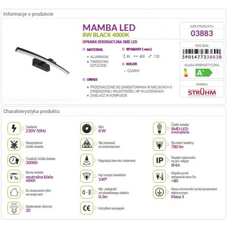 Rozwiązanie to pozwoliło na uzyskanie strumienia świetlnego wynoszącego 780 lm o barwie neutralnej 4000K przy jednoczesnym niskim poborze energii 8W co odpowiada około 70W klasycznego źródła światła. Oprawa przeznaczona jest do stosowania wyłącznie wewnątrz pomieszczeń. W oprawie wbudowany jest zasilacz, nie ma więc konieczności dokupowania dodatkowego osprzętu. Dodatkowo model ten posiada własny wyłącznik. Na pozostałych naszych aukcjach znajdziesz również inne rozmiary danej lampy!