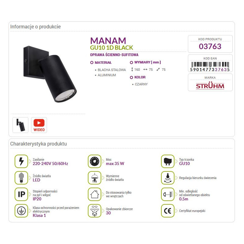 Lampa kinkiet ścienny MANAM 1D czarny 1xGU10 03763 STRUHM