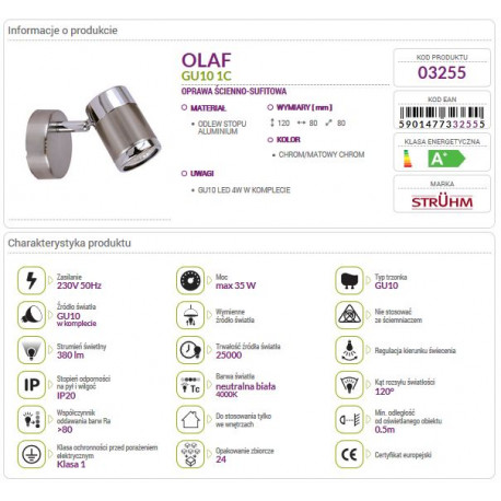 Linia lamp OLAF wykonana z odlewu stopu aluminium oszczędzi nam trudów i wątpliwości, które towarzyszą projektowaniu nowej przestrzeni oraz rozświetli na nowo wnętrze naszego domu – zarówno dosłownie, jak i w przenośni. Lampa posiada 1 źródło światła o gwincie GU10 max 35W. Dzięki żarówce LED (w komplecie) zaoszczędzisz do 90% energii elektrycznej! Na pozostałych naszych aukcjach znajdziesz również inne modele danej marki!