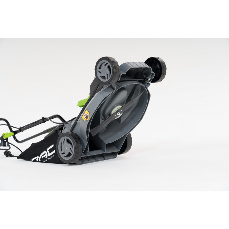 Duże koła chronią trawę, zapewniają lepszą trakcję oraz gwarantują łatwe poruszanie się po trawie lub nierównym terenie. Duży, aerodynamicznie ukształtowany kosz siatkowy cechujący się pojemnością 28 l przekonuje nie tylko swoim rozmiarem. Aerodynamiczne prowadzenie powietrza umożliwia optymalne wypełnienie przestrzeni kosza, a duży otwór i praktyczny uchwyt transportowy dają możliwość łatwego i całkowitego opróżniania.