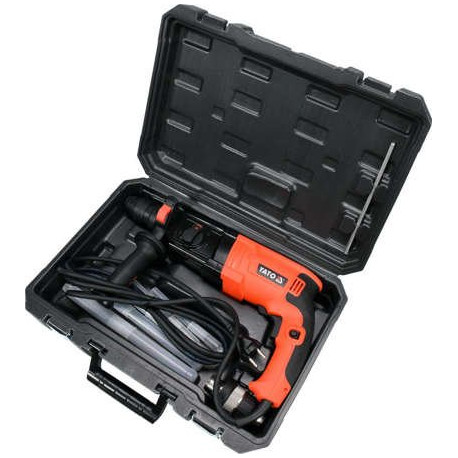 Młoto-wiertarka marki Yato. Uniwersalna młotowiertarka z udarem elektro pneumatycznym SDS PLUS o mocy 850W. Posiada sprzęgło wykonane z wysoko wytrzymałej stali zapewniające doskonałe zabezpieczenie przed przeciążeniem oraz zapewniające bezpieczeństwo operatora podczas zakleszczenia wiertła (np. na prętach zbrojeniowych przy wierceniu w żelbecie). Specjalny układ otworów wentylacyjnych zabezpiecza urządzenie przed pyłem oraz optymalizuje obieg powietrza chłodzącego wirnik.