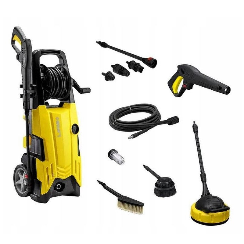 W zestawie z myjką znajdują się różne akcesoria, które znacząco zwiększają jej funkcjonalność. Pistolet ciśnieniowy wykonany z tworzywa wzmacnianego włóknem szklanym jest lekki i poręczny, co ułatwia precyzyjne kierowanie strumienia wody. Czarna szczotka rotacyjna obracająca się pod wpływem ciśnienia jest idealna do dokładnego mycia, natomiast szczotka przeznaczona do delikatniejszych powierzchni sprawdzi się przy czyszczeniu elementów samochodowych. W zestawie znajduje się również wąż o długości 6 m z szybkozłączkami, który zapewnia wygodę i swobodę ruchu podczas pracy. Lanca do wymiennych dysz umożliwia podłączenie różnych dysz, co zwiększa wszechstronność urządzenia. Dysza turbo, zwiększająca ciśnienie wody nawet do 250 bar, jest idealna do usuwania trudniejszych zabrudzeń, natomiast dysza regulowana pozwala na dostosowanie strumienia wody do aktualnych potrzeb, co zapewnia większą kontrolę nad procesem czyszczenia.