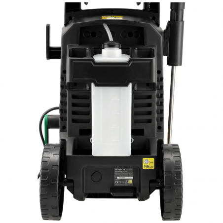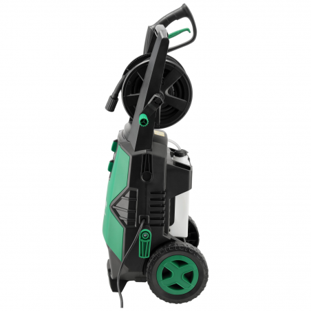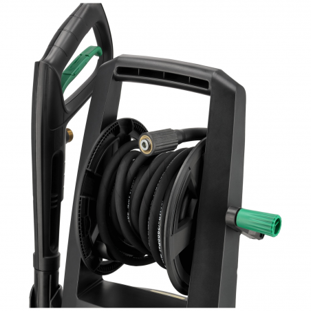 Myjka posiada 8-metrowy wąż ciśnieniowy w oplocie stalowym, który można wygodnie nawinąć na wbudowany bęben. Uchwyt na pistolet, duże koła transportowe i przewód zasilający o długości 5 metrów zapewniają swobodę pracy w terenie. Regulowany zbiornik na detergent pozwala dobrać odpowiednie proporcje środka czyszczącego do zadania.