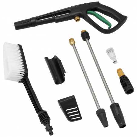 W zestawie znajdują się pistolet z mosiężnym złączem, dwie lance (turbo i regulowana), szczotka uniwersalna, adapter, filtr wody oraz wysokociśnieniowy wąż. Wszystkie elementy są solidnie wykonane, co przekłada się na ich trwałość. Myjka jest w pełni przygotowana do intensywnej pracy zaraz po podłączeniu.