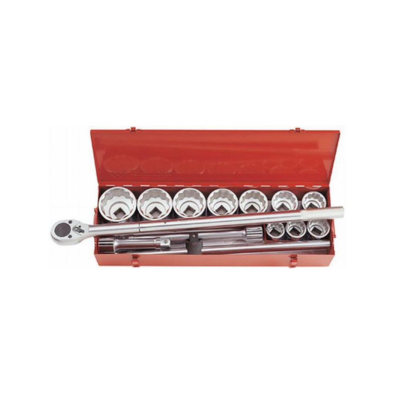 Komplet zawiera 10 nasadek krótkich 1" o profilu 12-kątnym w popularnych rozmiarach od 36 do 80 mm, a także praktyczne akcesoria: grzechotkę z moletowanym uchwytem, dwie przedłużki i pokrętło przesuwne. Całość umieszczona jest w solidnej kasecie, ułatwiającej transport i organizację pracy.