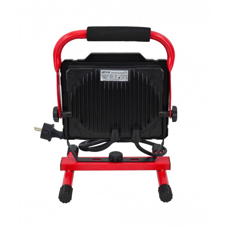 Głowica reflektora jest uchylna, co pozwala na precyzyjne ustawienie kąta oświetlenia według potrzeb. Dzięki temu można skierować strumień światła dokładnie tam, gdzie jest potrzebny, co jest niezwykle przydatne podczas prac wymagających precyzji, takich jak malowanie, montaż czy naprawy. Duże pokrętła regulacyjne są łatwe w obsłudze, co pozwala na szybkie i wygodne ustawienie lampy bez potrzeby używania dodatkowych narzędzi. Strumień świetlny wynoszący 2850 lumenów zapewnia intensywne i jasne światło, które idealnie sprawdzi się zarówno w trakcie prac budowlanych i remontowych, jak i w warsztacie, garażu, a nawet podczas biwaków czy w studiu fotograficznym. Barwa światła 6000K to chłodne, białe światło, które doskonale nadaje się do precyzyjnych zadań i zapewnia dobrą widoczność.