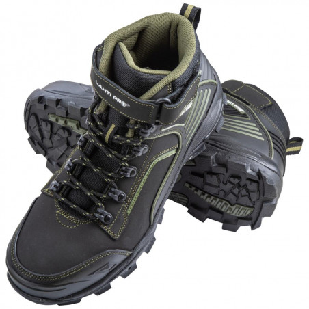 • MATERIAŁ: Wierzch: skóra nubukowa, zewnętrzna konstrukcja obuwia w części przedniej, bocznej i tylnej wzmocniona tworzywem TPR. Podszewka: dzianina siatkowa. Wyściółka: wymienna, futerkowa. Podeszwa: gumowa o właściwościach antypoślizgowych (podłoże stalowe i ceramiczne), odporna na olej napędowy, głęboki i agresywny bieżnik zwiększa przyczepność do podłoża oraz zapewnia wysoką stabilność obuwia
