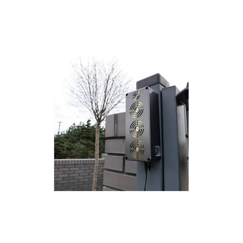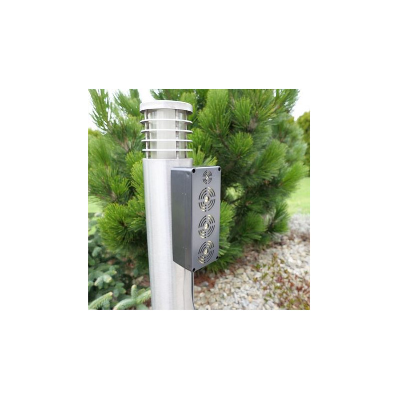 Dodatkowo w zestawie z urządzeniem otrzymujemy metalową blaszkę z otworami, którą za pomocą załączonych wkrętów można przykręcić do dowolnej powierzchni a następnie mocować do niej odstraszacz. Tym sposobem urządzenie możemy przymocować do desek czołowych, filarów drewnianych, drewnianych pergol itp.