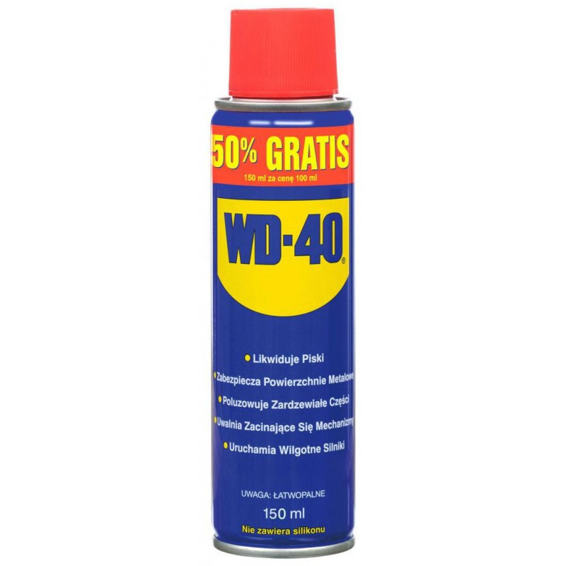 Jest doskonałym izolatorem i szybko eliminuje spięcia spowodowane wilgocią. WD-40 rozprowadza czynniki antykorozyjne na całej powierzchni pokrytego przedmiotu, łącznie z mikroskopijnymi nierównościami. Precyzyjnie wysusza pokrywaną powierzchnię, eliminując mikroskopijne krople, które są często przyczyną korozji. Precyzyjnie dostaje się pod warstwę brudu, tłuszczów, smarów i olejów, czyszcząc spryskana powierzchnię. Rozpuszcza większość materiałów samoprzylepnych, ułatwiając usuwanie nalepek i innych klejących zabrudzeń.